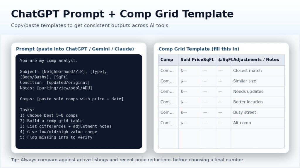- Use AI for structure: comp tables, adjustment notes, and a value range.