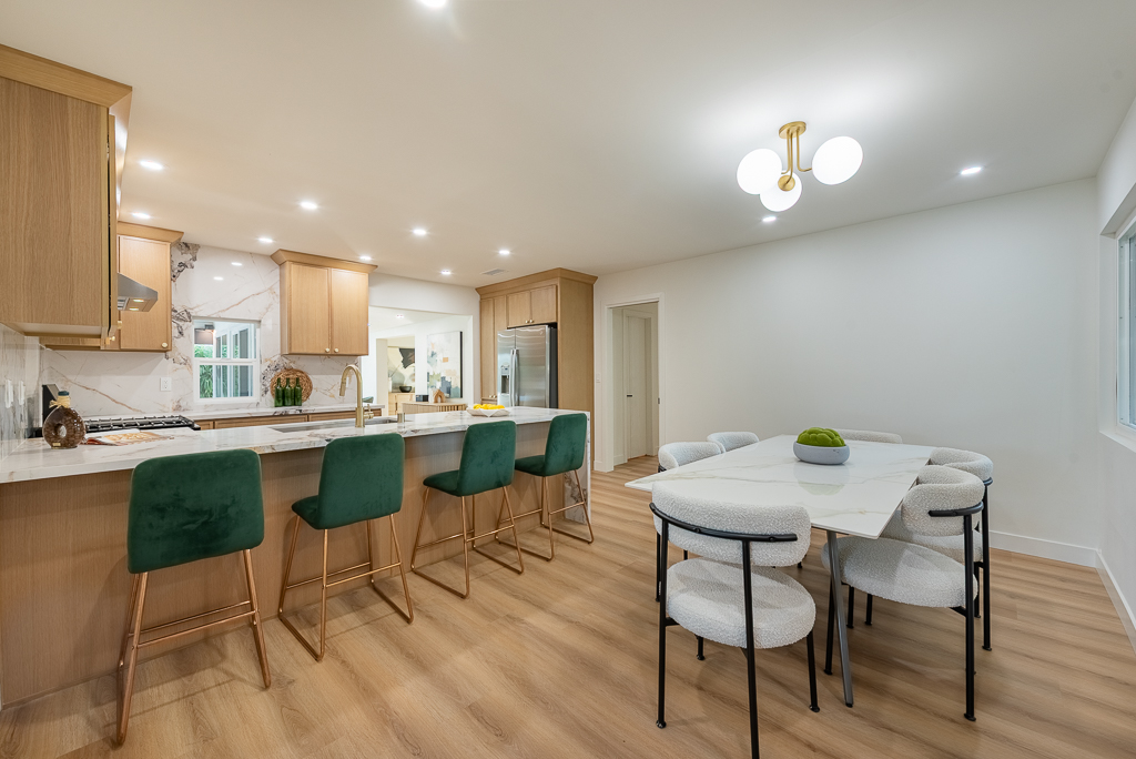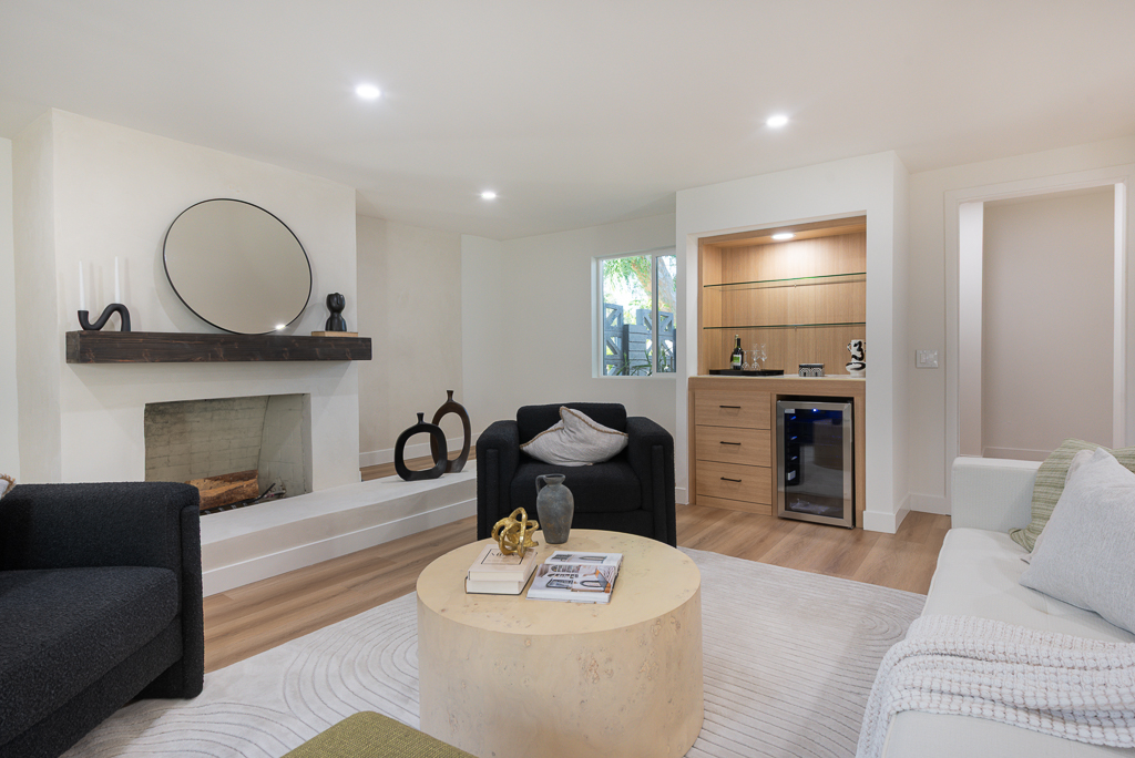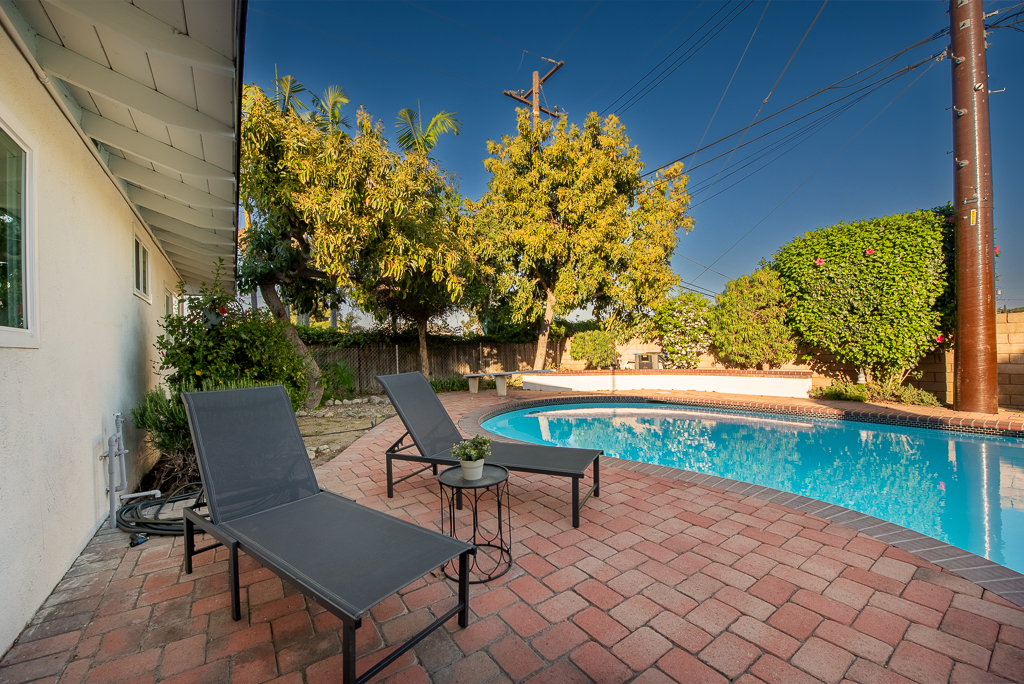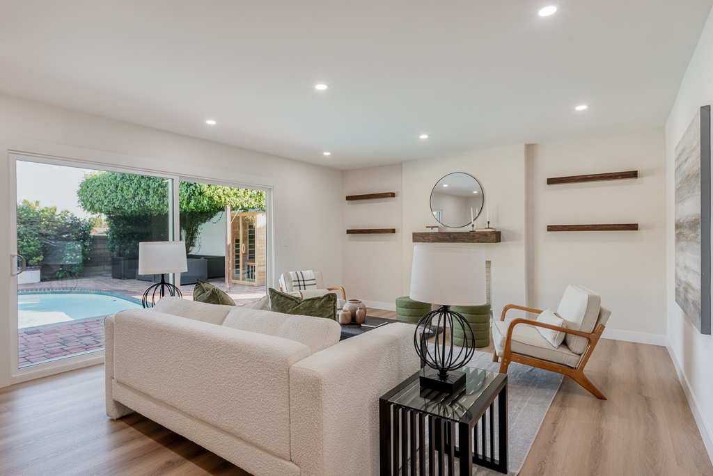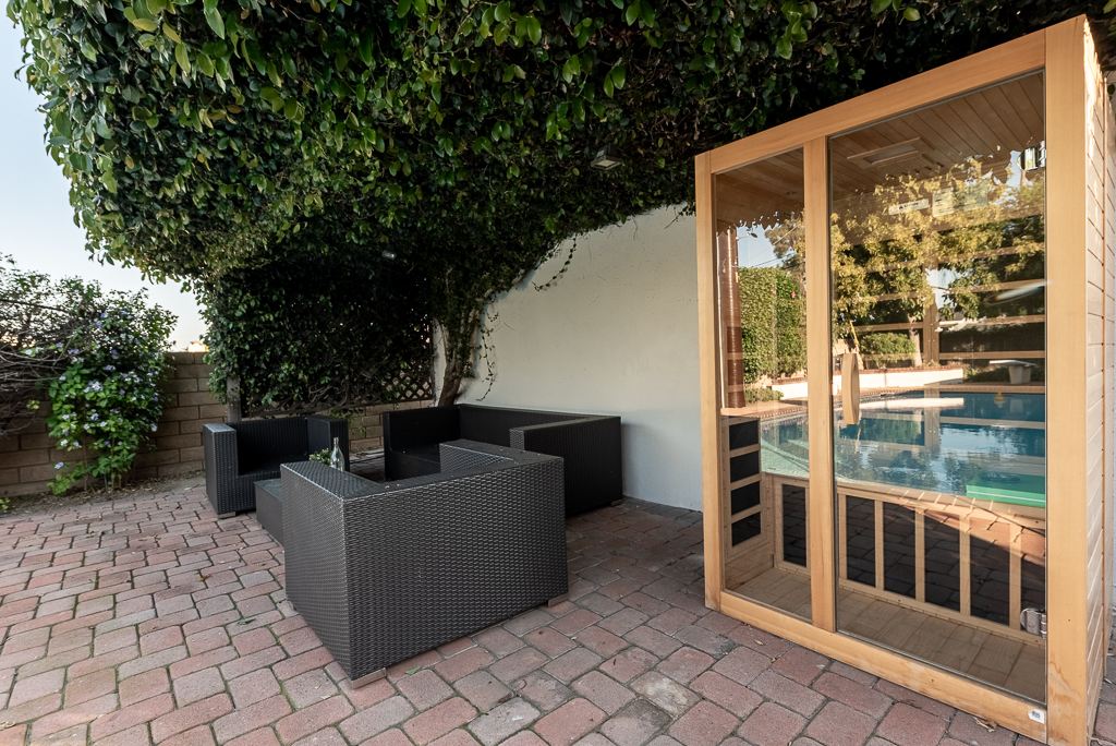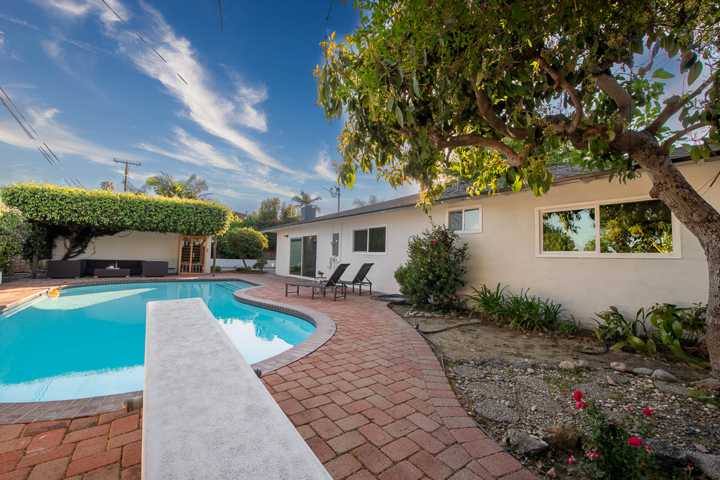 Single-story Ranch Style home with ADU potential, Pool, Sauna, fully remodeled, new roof, cul-de-sac location in Hacienda Heights. This beautifully upgraded 4-bedroom, 3.5-bath residence sits on an 9,298 sq ft lot and offers a seamless blend of modern design and resort-style living. The open-concept layout is filled with natural light and features a formal living room with a custom Venetian plaster fireplace, an elegant dining area, and a spacious family room with a second fireplace and built-in dry bar with wine refrigerator, ideal for entertaining. The designer kitchen is equipped with a waterfall peninsula, quartz countertops, slim shaker cabinetry, a custom backsplash, and a full suite of stainless steel appliances including a gas range, hood, refrigerator, and dishwasher. A versatile sunroom provides flexible space for an office, lounge, or playroom. Extensive upgrades include new vinyl flooring, fresh interior and exterior paint, updated moldings, modern doors and hardware, vinyl windows, and new sliding glass doors. All bathrooms have been fully remodeled with custom tile, new vanities, and designer fixtures. The private backyard offers a heated pool with new white epoxy finish and updated waterline tile, expansive paver patio, multiple covered seating areas, and a custom sauna beneath a vine-covered pergola. Additional highlights include a new roof, updated electrical, central HVAC (2022), new garage door with frosted glass panels, new front entry door with Ring doorbell, and a detached two-car garage with ADU potential for guest house or rental income. The grounds are enhanced by mature fruit trees including grapefruit, pomegranate, orange, lemon, tangerine, and avocado, all conveniently located near shopping, dining, schools, and the 60 freeway.