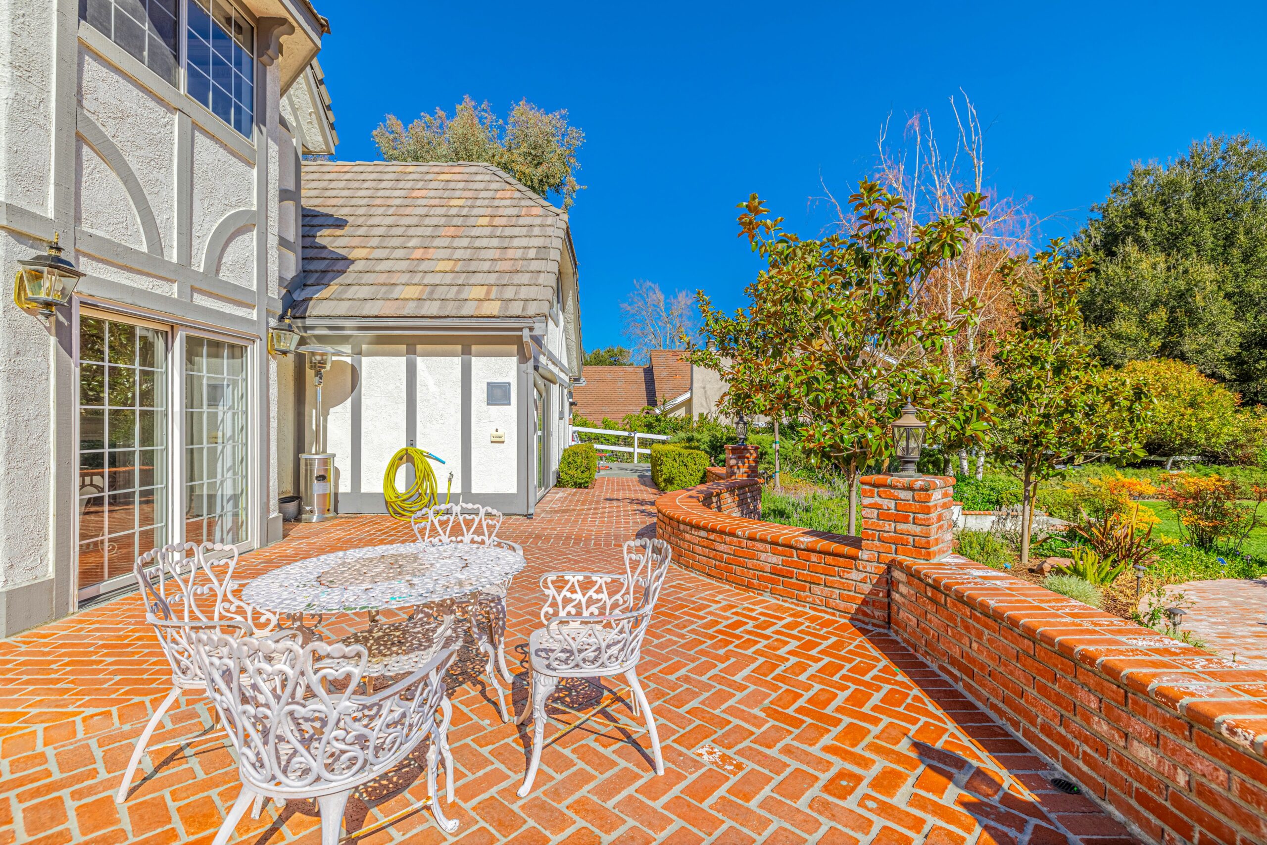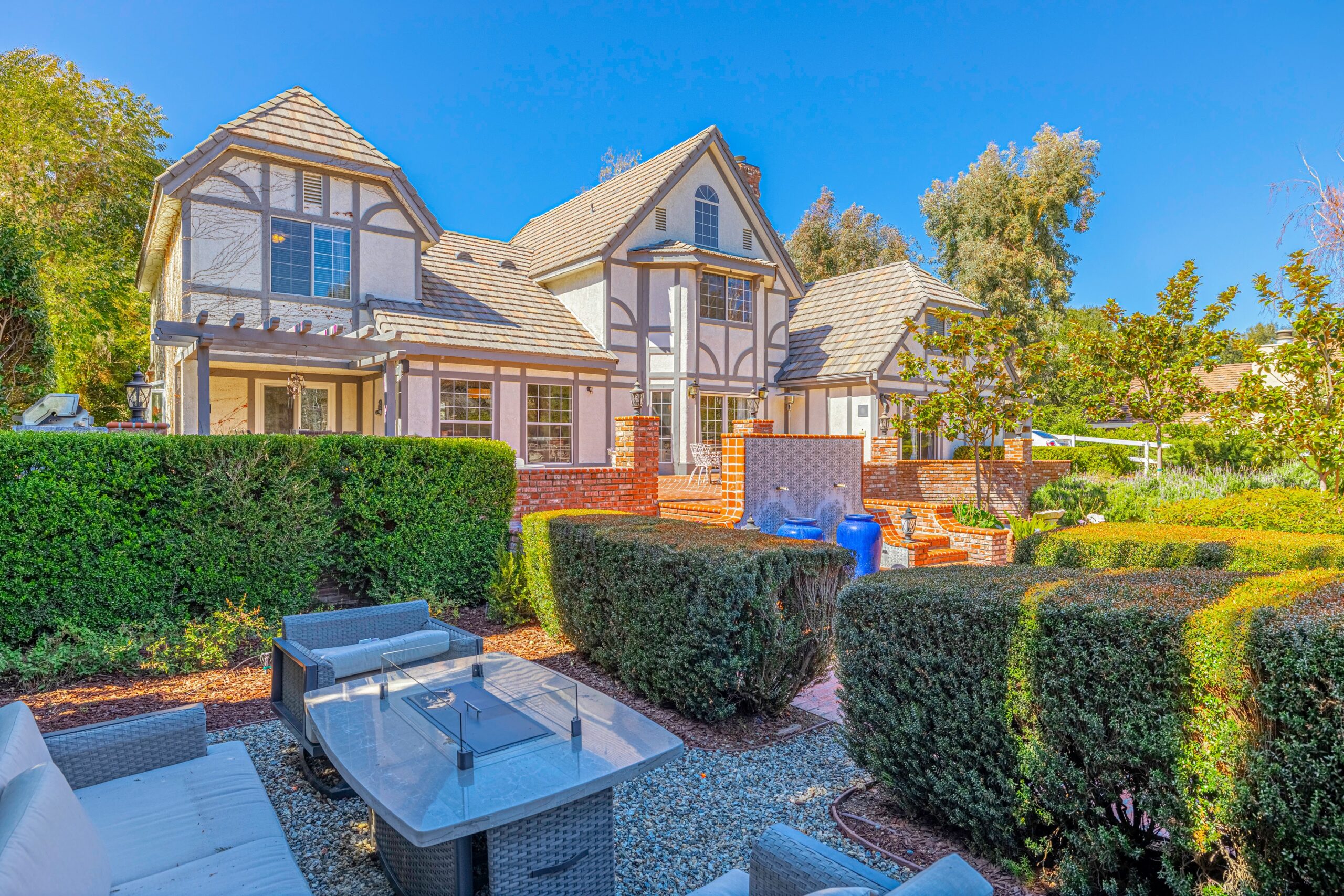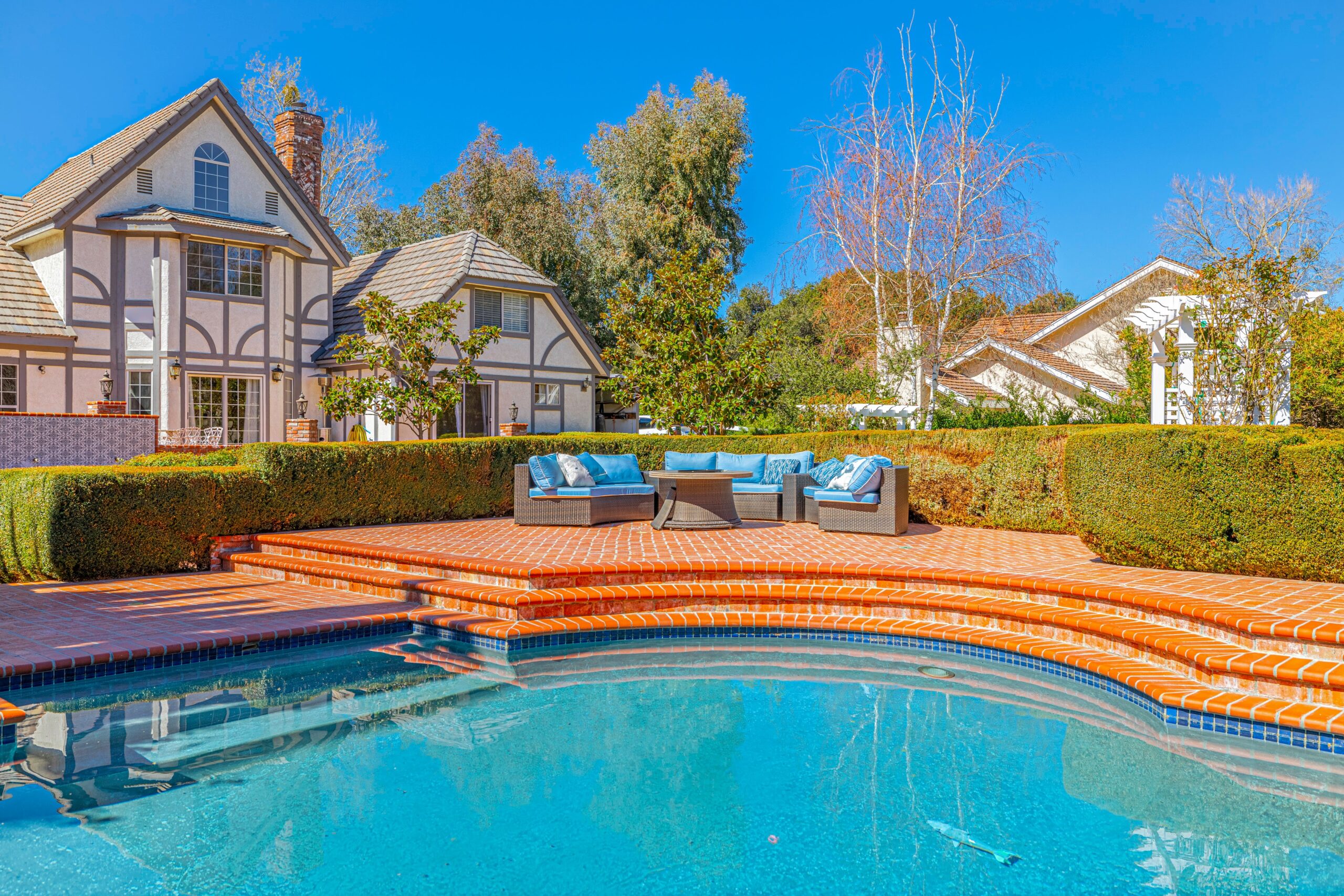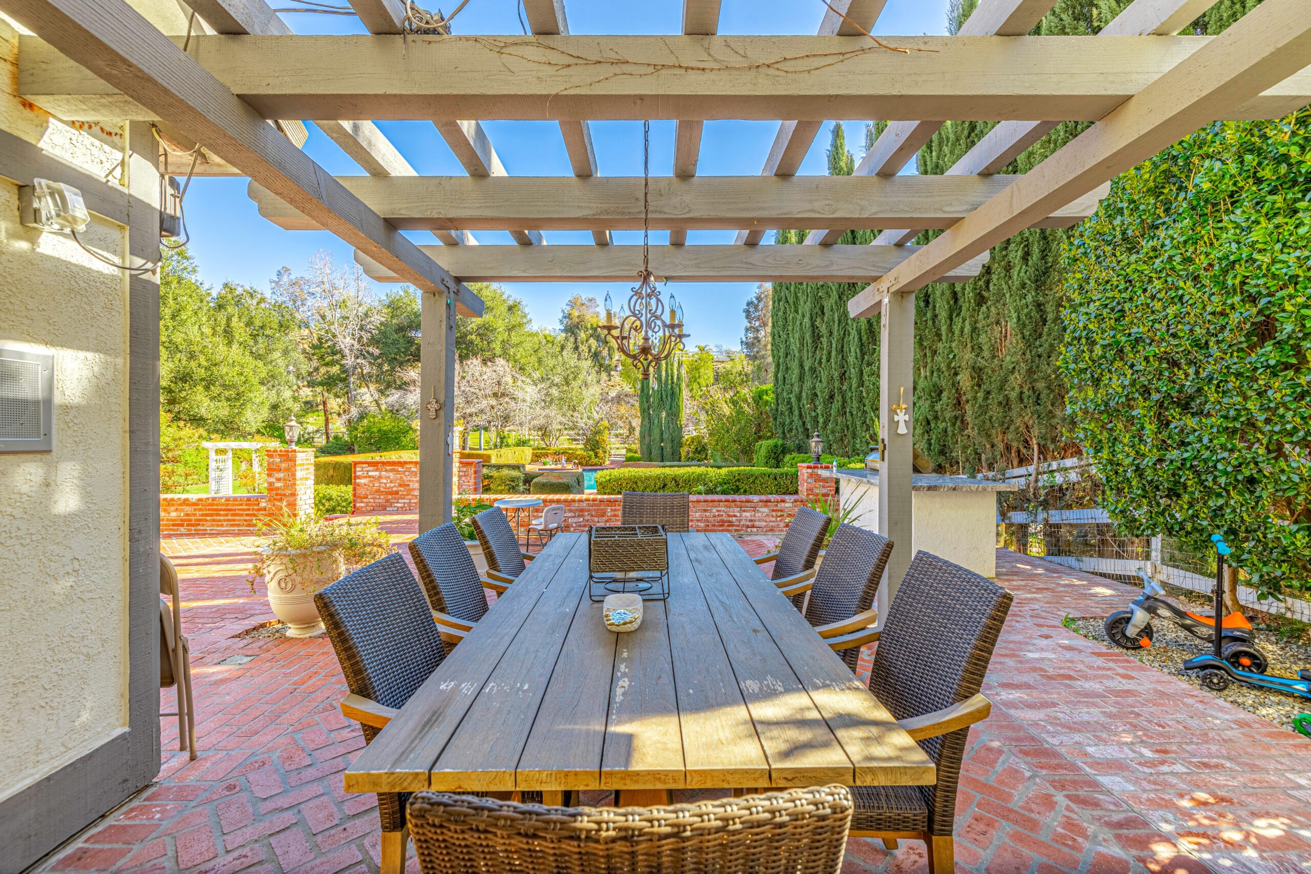 Outdoors, enjoy a tranquil setting with mature oak and fruit trees, a sparkling pool, and even a running creek—all visible from multiple vantage points, including the serene morning-coffee-and-evening-wine spots.
