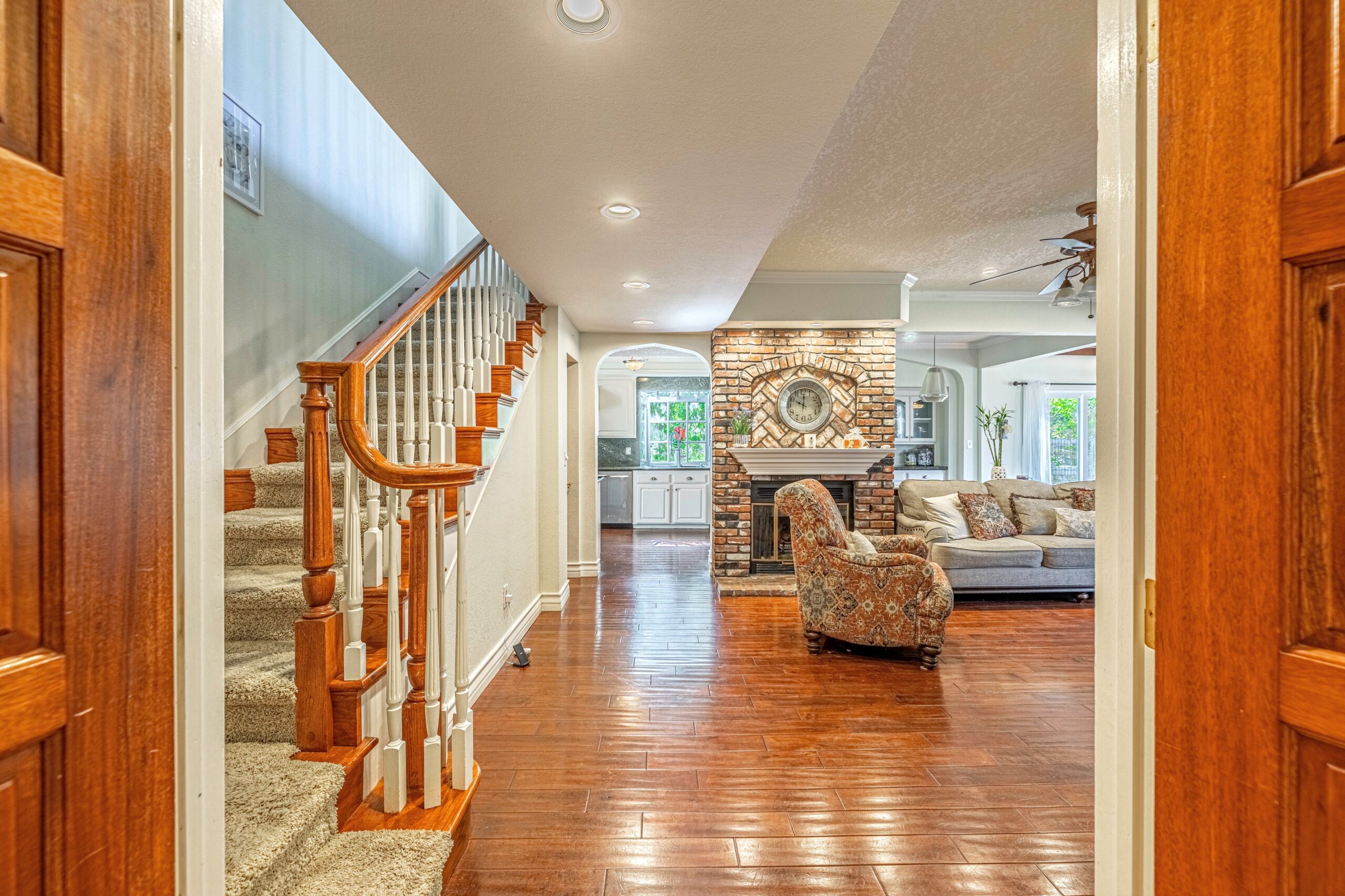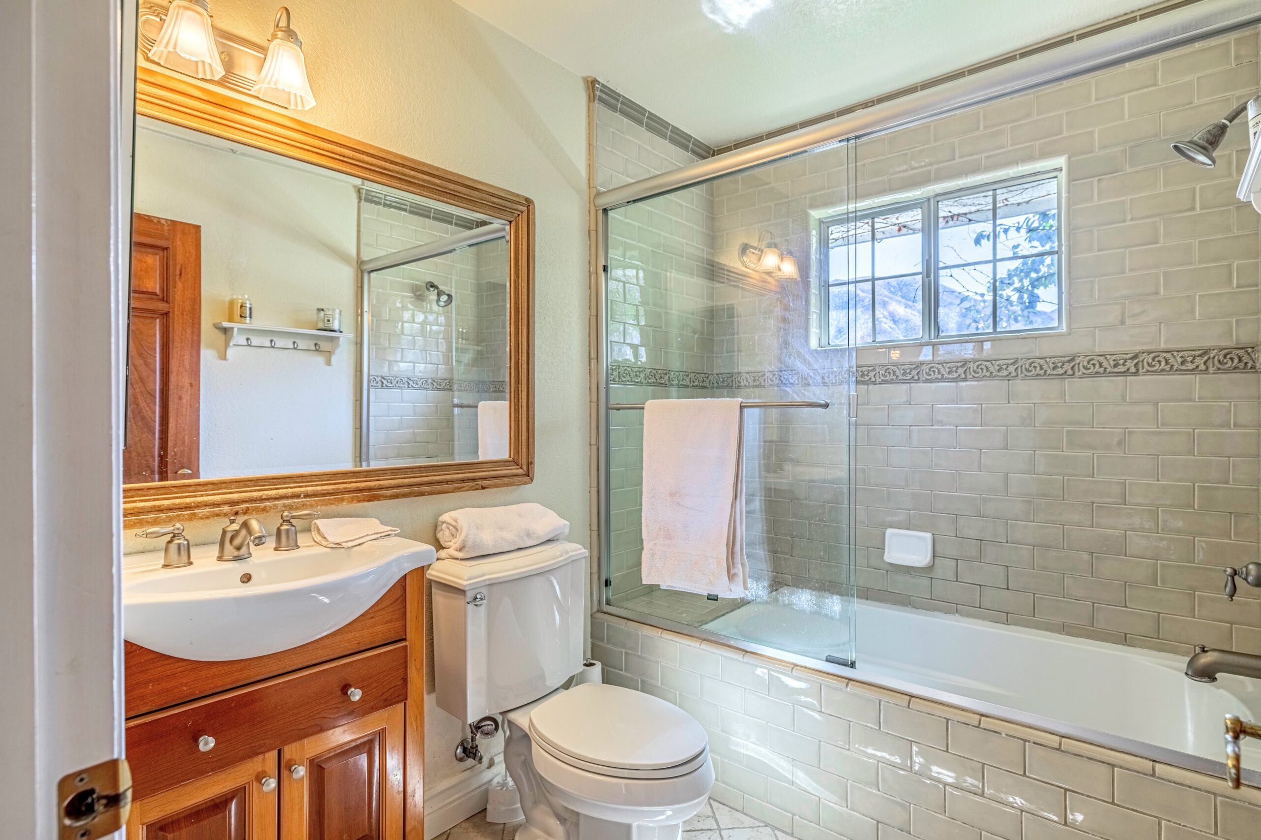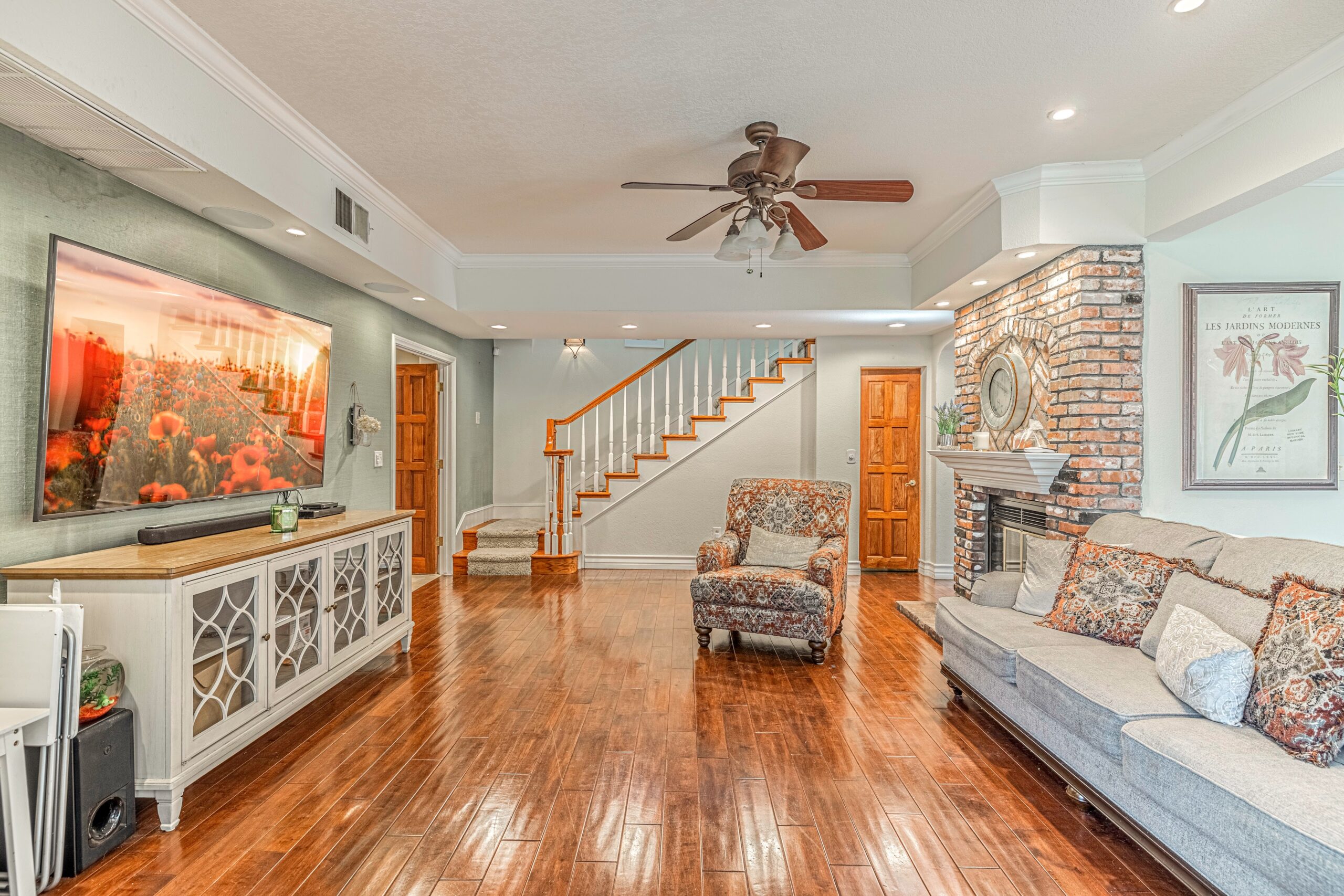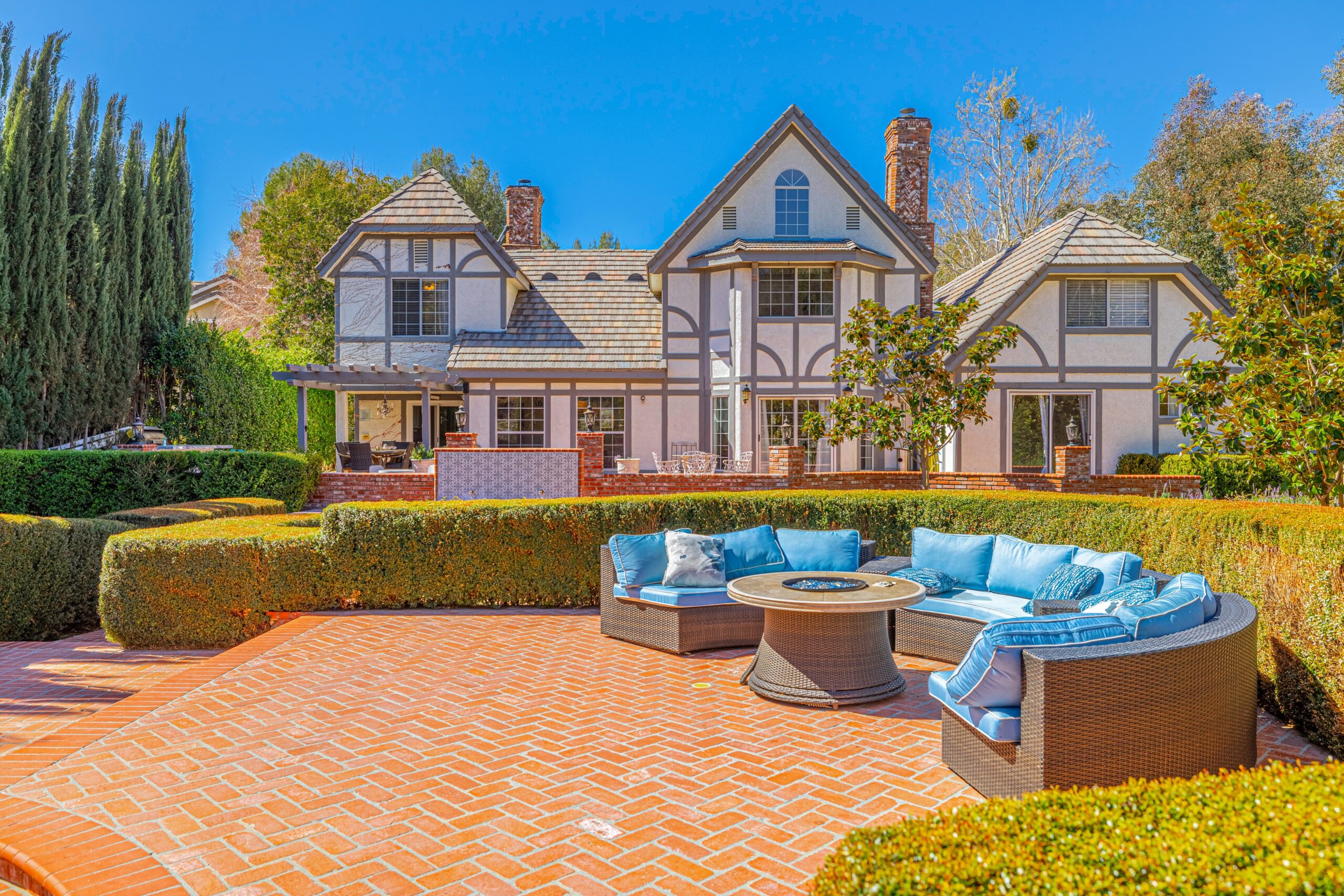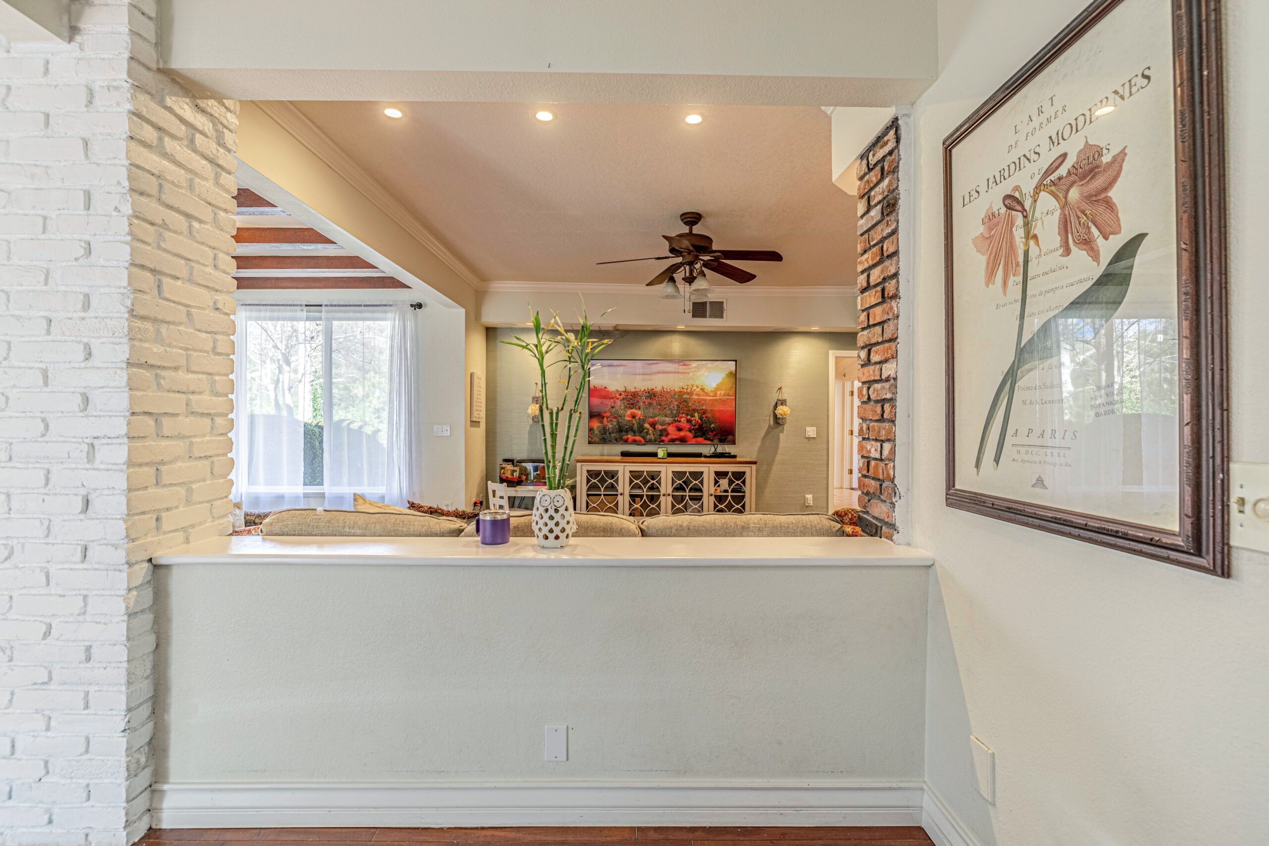 Outdoors, enjoy a tranquil setting with mature oak and fruit trees, a sparkling pool, and even a running creek—all visible from multiple vantage points, including the serene morning-coffee-and-evening-wine spots.