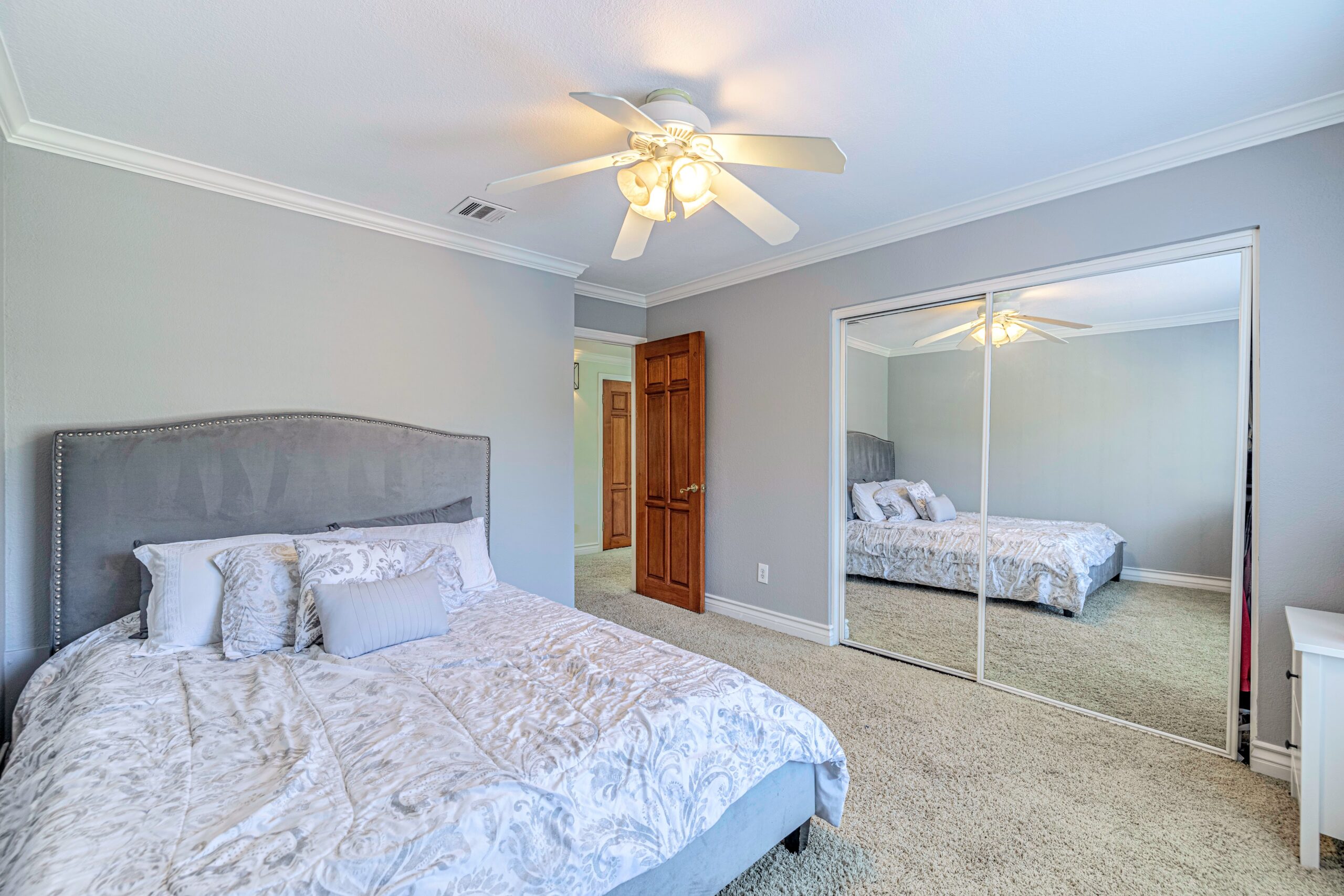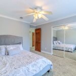 The master suite offers a spa-like escape with a spacious walk-in closet, soaking tub, dual vanities, and sweeping backyard views. Two additional en-suite bedrooms sit on the main level, while the upper-level retreat provides a large bedroom and bonus room accessible by a private staircase—ideal for teens, guests, or multi-generational living.